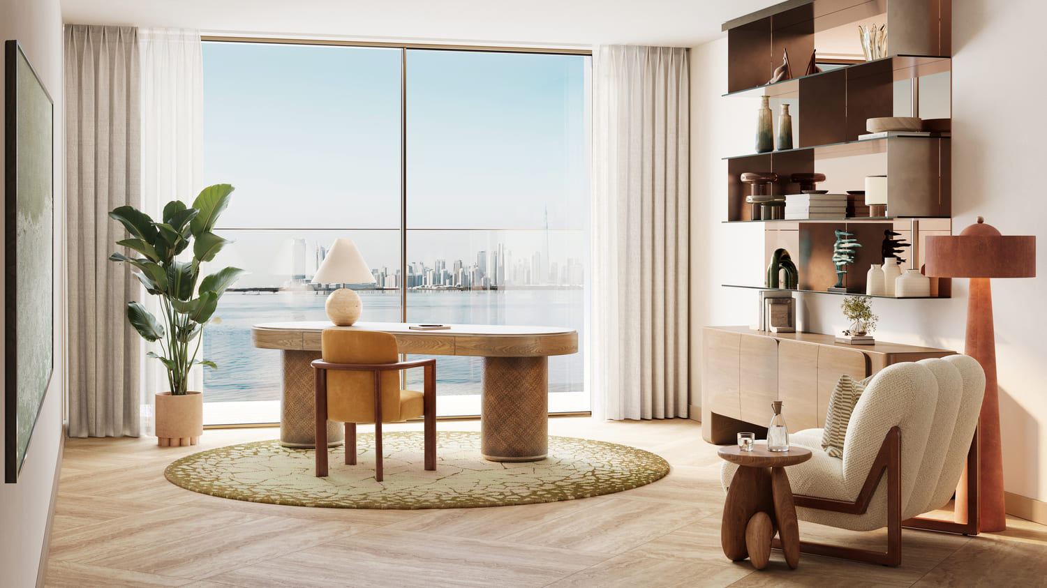 Neuf immeubles longent 500 m de plage privée, dévoilant des panoramas ouverts sur le Golfe et la skyline. Pierre naturelle, boiseries, hauteurs sous plafond jusqu’à 6 m, plans fluides et terrasses généreuses—avec piscines privées sur certaines typologies—offrent la sensation d’une villa suspendue entre ciel et mer.